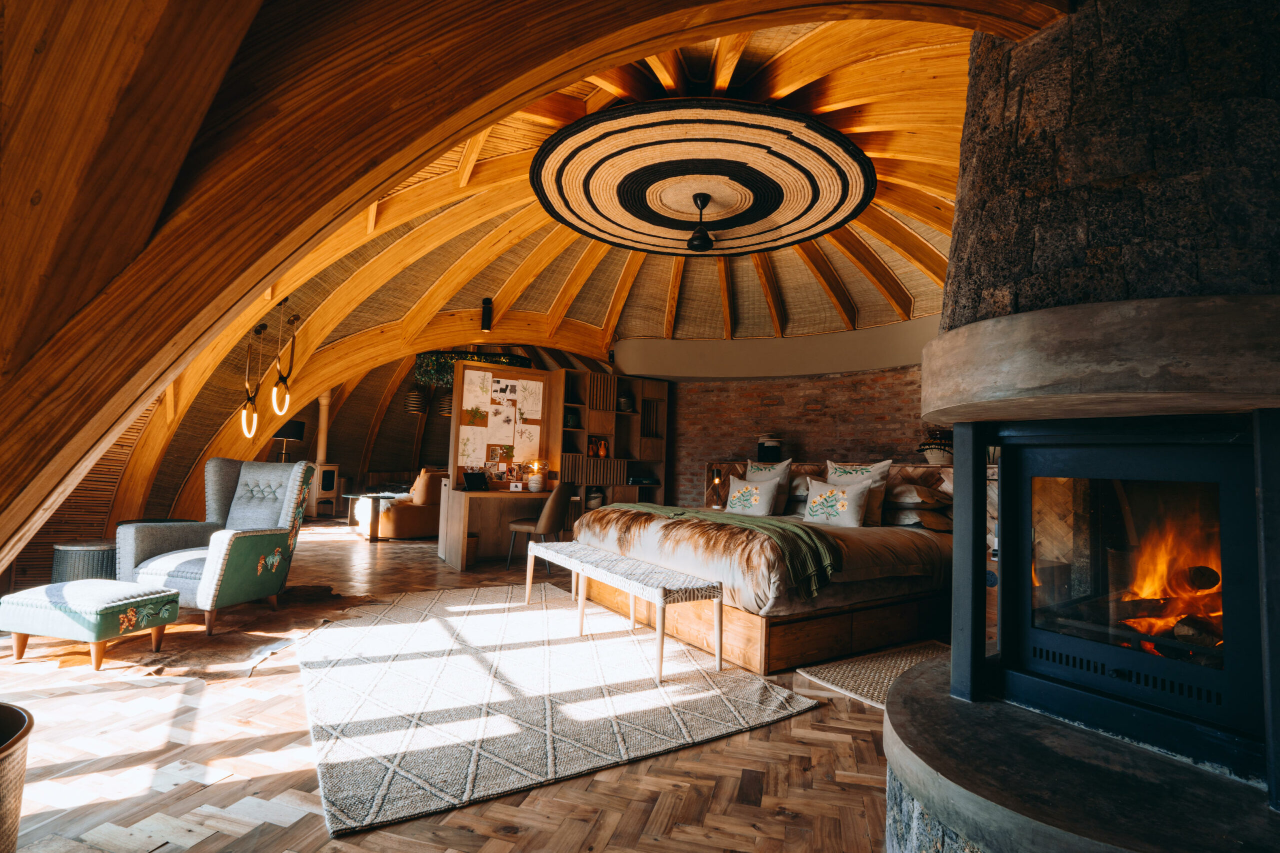 4 à 6 Villas forestières exclusives : toits de chaume, murs de pierre volcanique, touches de bois et vannerie, terrasse privée avec vue panoramique sur les chaînes volcaniques, cheminées accueillantes, décoration raffinée, salon-feu, cave à vins parfois, salle de bains luxueuse